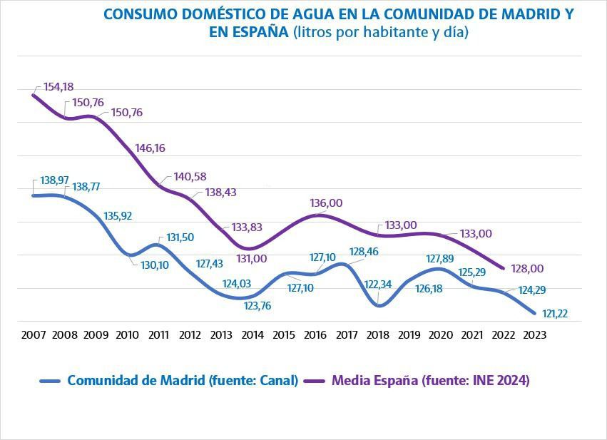 En conclusión, el Canal de Isabel II indica que “la regeneración y posterior reutilización del agua, la renovación masiva de tuberías, la detección temprana de fugas, la concienciación ciudadana y, en general, todas las actuaciones en pro de la eficiencia, han conseguido reducir el consumo de agua per cápita en la Comunidad de Madrid más de un 30 por ciento desde el año 2005”.