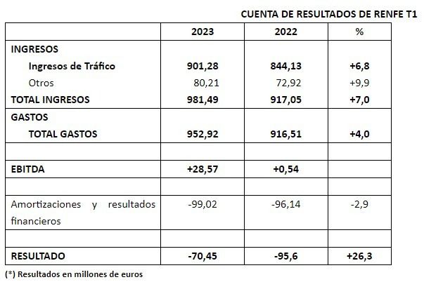 De esta forma, el EBITDA acumulado de la compañía se sitúa a finales de marzo en +28,6 M euros, una cifra muy superior a la del año pasado, cuando Renfe cerró el trimestre con un EBITDA cercano a los 500.000?. Incluidas las amortizaciones y los gastos financieros, el resultado provisional de Renfe se ha situado en -70,45 M euros, lo que supone una mejora de más de 25 M euros (el año pasado era de 95,6 M euros).