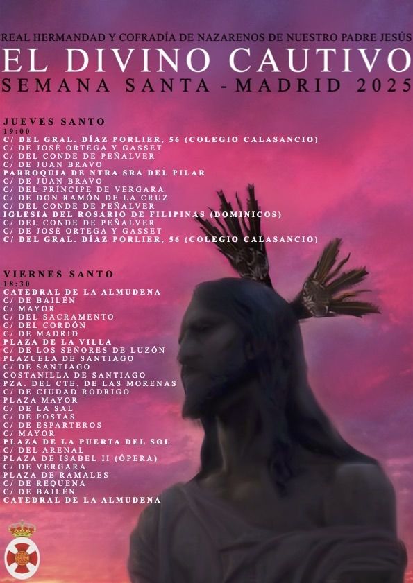 La Hermandad del Divino Cautivo ya ha tenido su estreno durante el Jueves Santo. Sin embargo, la salida de este Viernes Santo es más especial ya que este año, la hermandad celebra su 80 aniversario, un hito importante que trae consigo varias novedades significativas en la organización de sus procesiones. La principal de ellas es un nuevo recorrido, que será distinto a los recorridos tradicionales de años anteriores. "Es un recorrido muy bonito y nos hace mucha ilusión porque por primera vez, el Divino Cautivo saldrá en procesión desde la Catedral de la Almudena, una ubicación que nunca habíamos utilizado antes", ha contado el Hermano Mayor, Juan Manuel García.