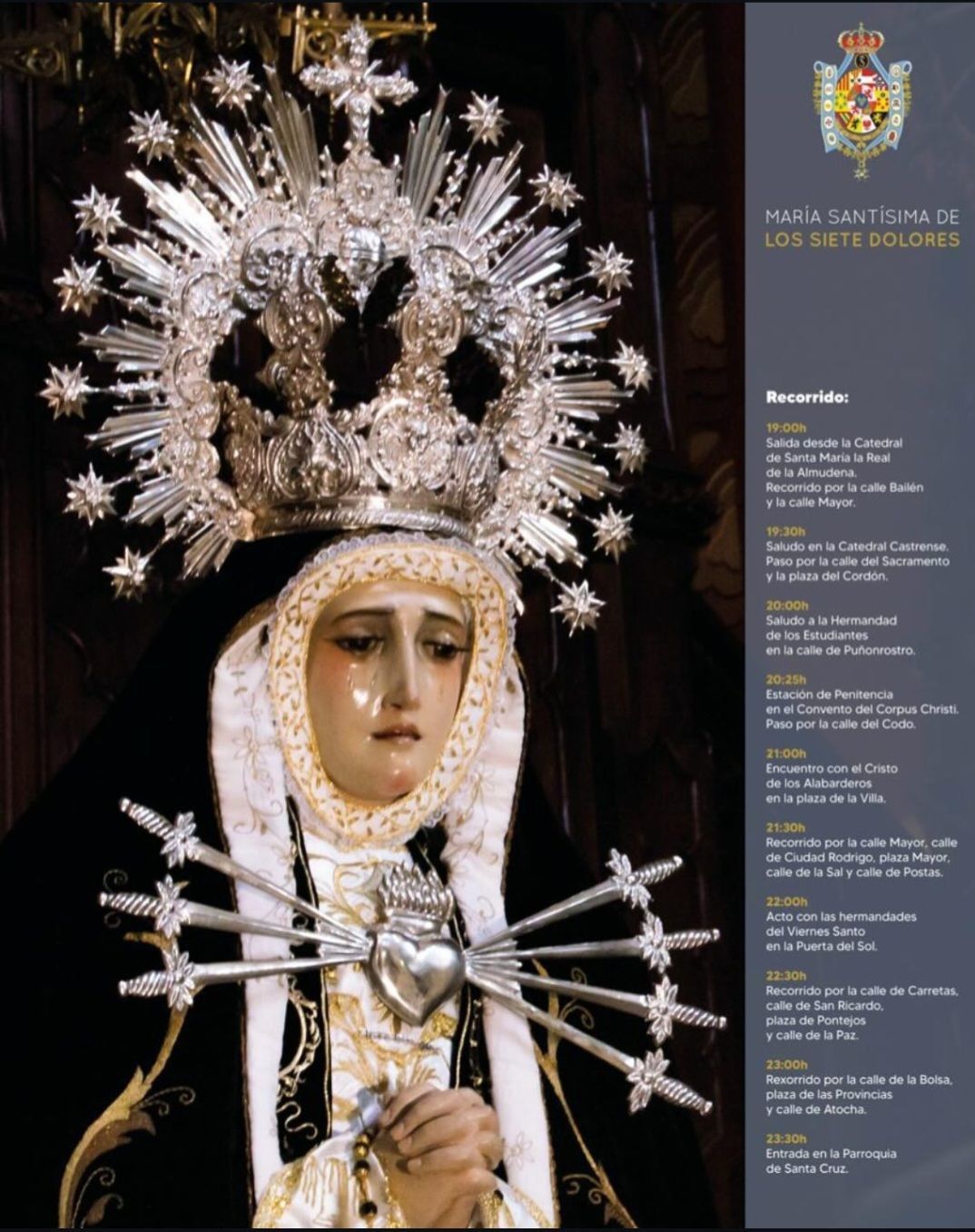 Organizada por la Real Congregación de Esclavos de María Santísima de los Siete Dolores, Santísimo Cristo de la Agonía y Descendimiento de la Santa Cruz, la procesión se celebrará este Viernes Santo con salida a las 19:00 horas desde la Catedral. El cortejo realizará estación de penitencia a las 20:45 horas en el Monasterio de las Carboneras. A las 21:00 horas está previsto su paso por la emblemática Plaza de la Villa, y a las 22:00 horas llegará a la Puerta del Sol, donde la imagen de la Virgen será recibida por numerosos fieles.
