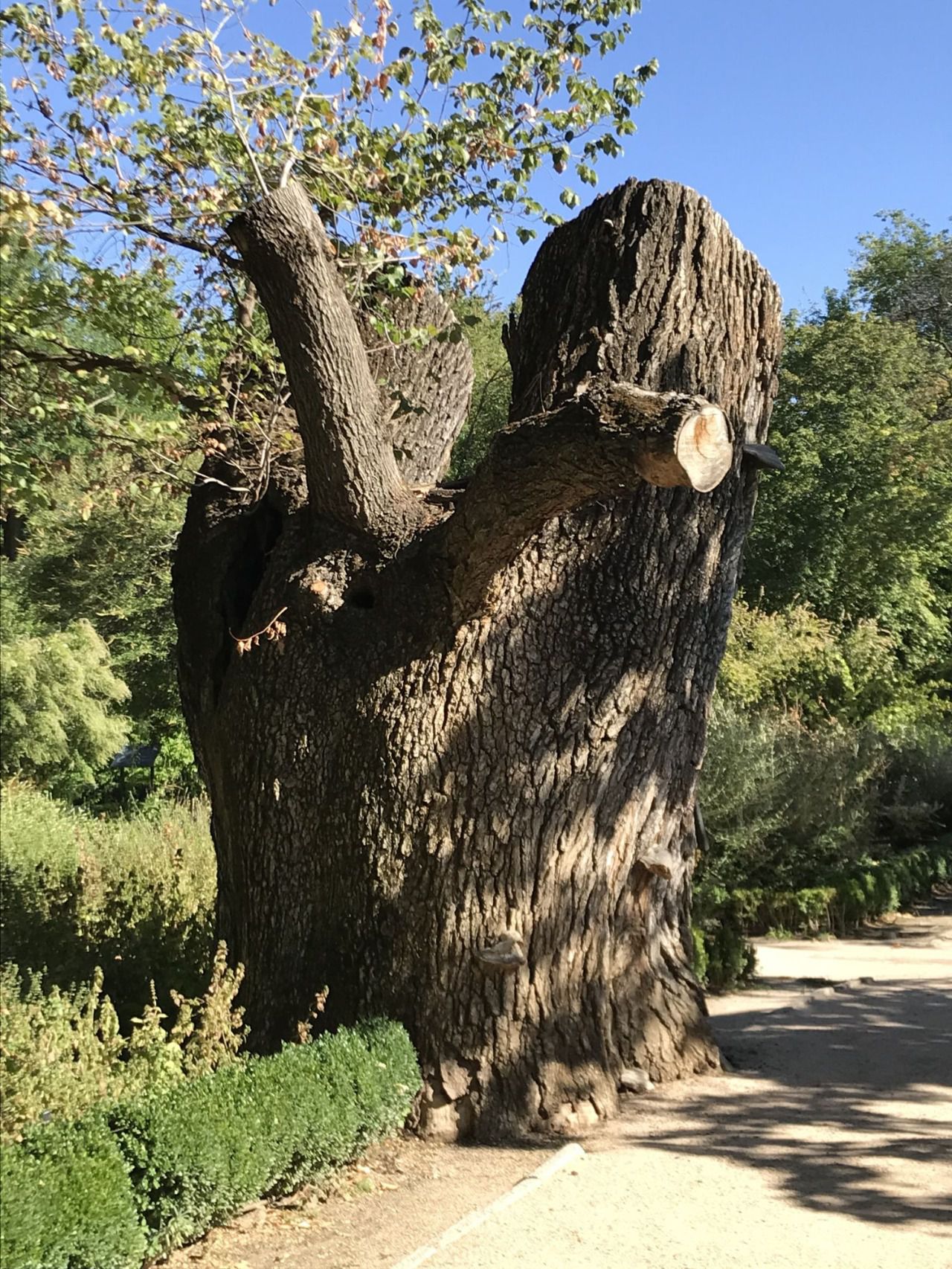 El ocaso de un venerable árbol. El emblemático Olmo “Pantalones” del RJB ha sucumbido a la grafiosis, enfermedad que le fue detectada en mayo de 2014 y que ha acabado prácticamente con todos los olmos viejos de la Península Ibérica. Ninguno de los tratamientos terapéuticos aplicados hasta ahora han podido frenar el avance del hongo “Ophiostoma novo-ulmi” y el resultado final es que han talado sus ramas secundarias y ya solo queda como testimonio de su majestuosidad el característico porte por el que recibió su apodo.