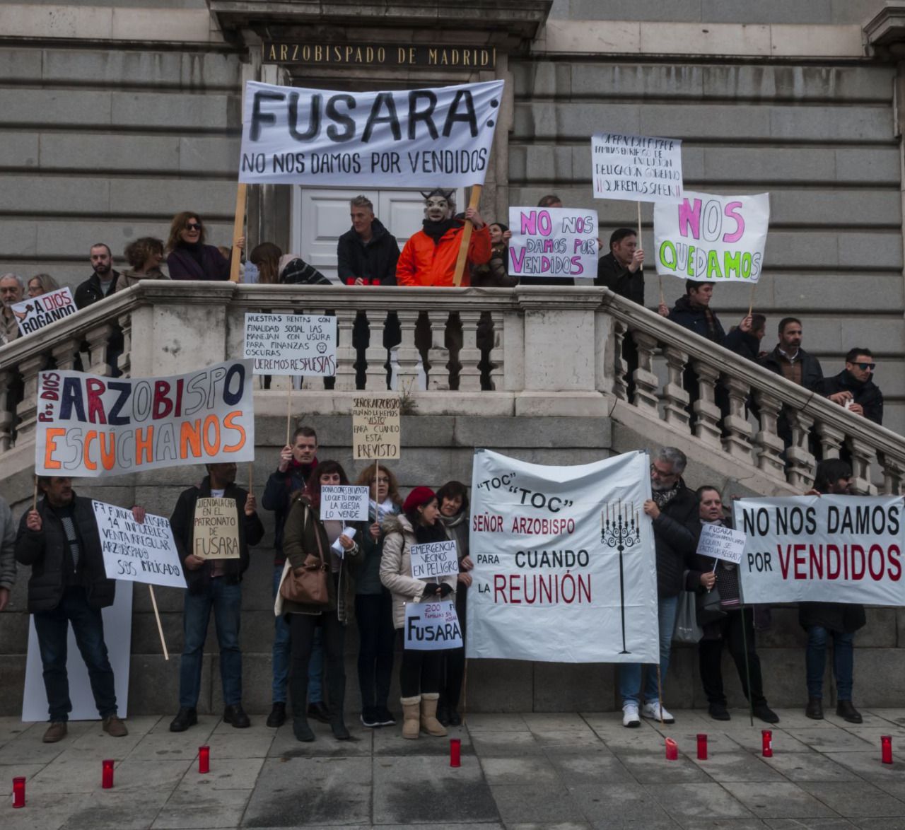 Los inquilinos afectados por la venta "opaca" de viviendas por parte de la Fundación de Santamarca y de San Ramón y San Antonio (Fusara) -fundación civil gestionada por la Iglesia, en cuyo patronato se encuentran el Arzobispo de Madrid, el Alcalde de Madrid y el Delegado del Gobierno de la Comunidad de Madrid, entre otros- se han concentrado este domingo ante el edificio del Arzobispado en la capital para protestar y pedir explicaciones.
